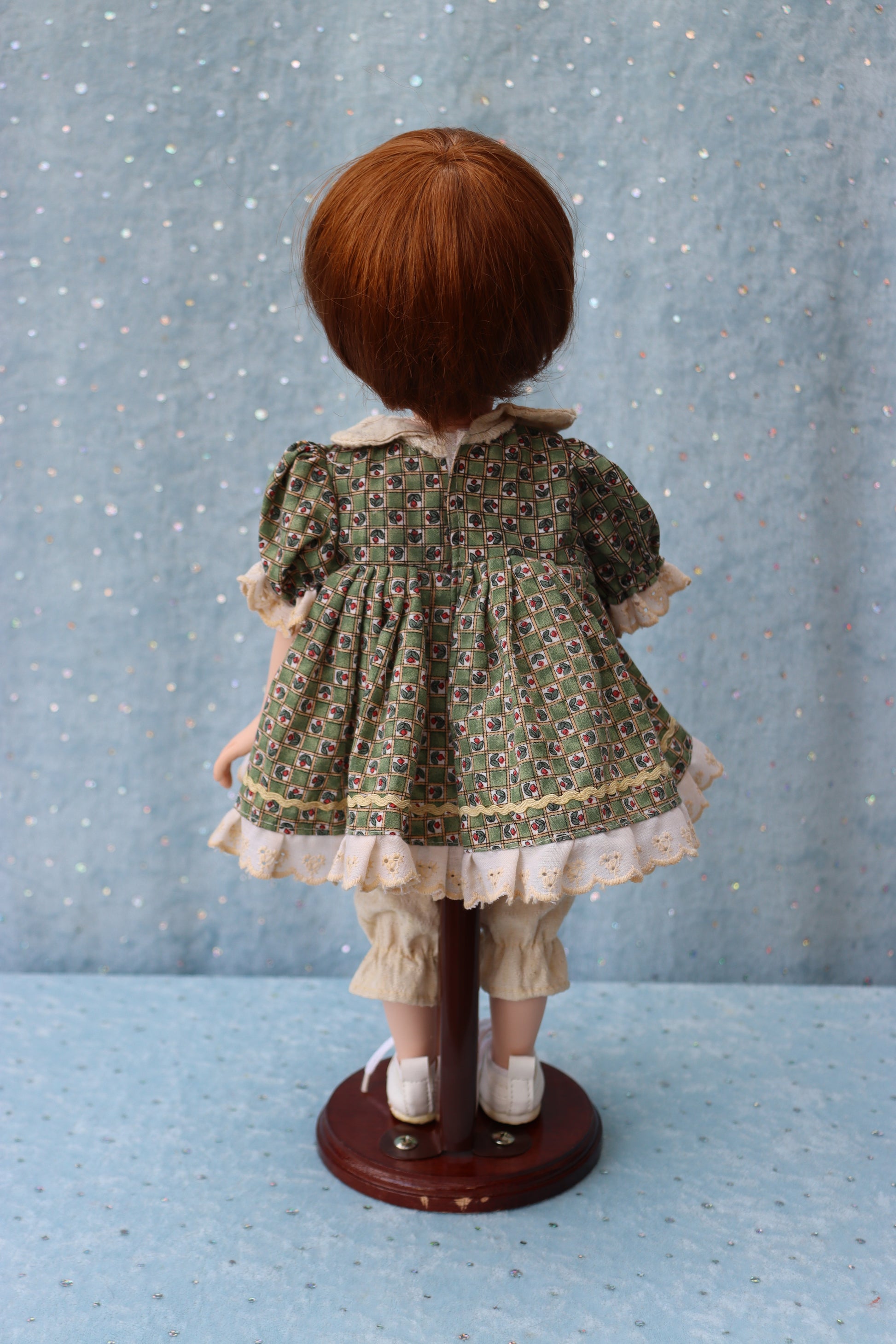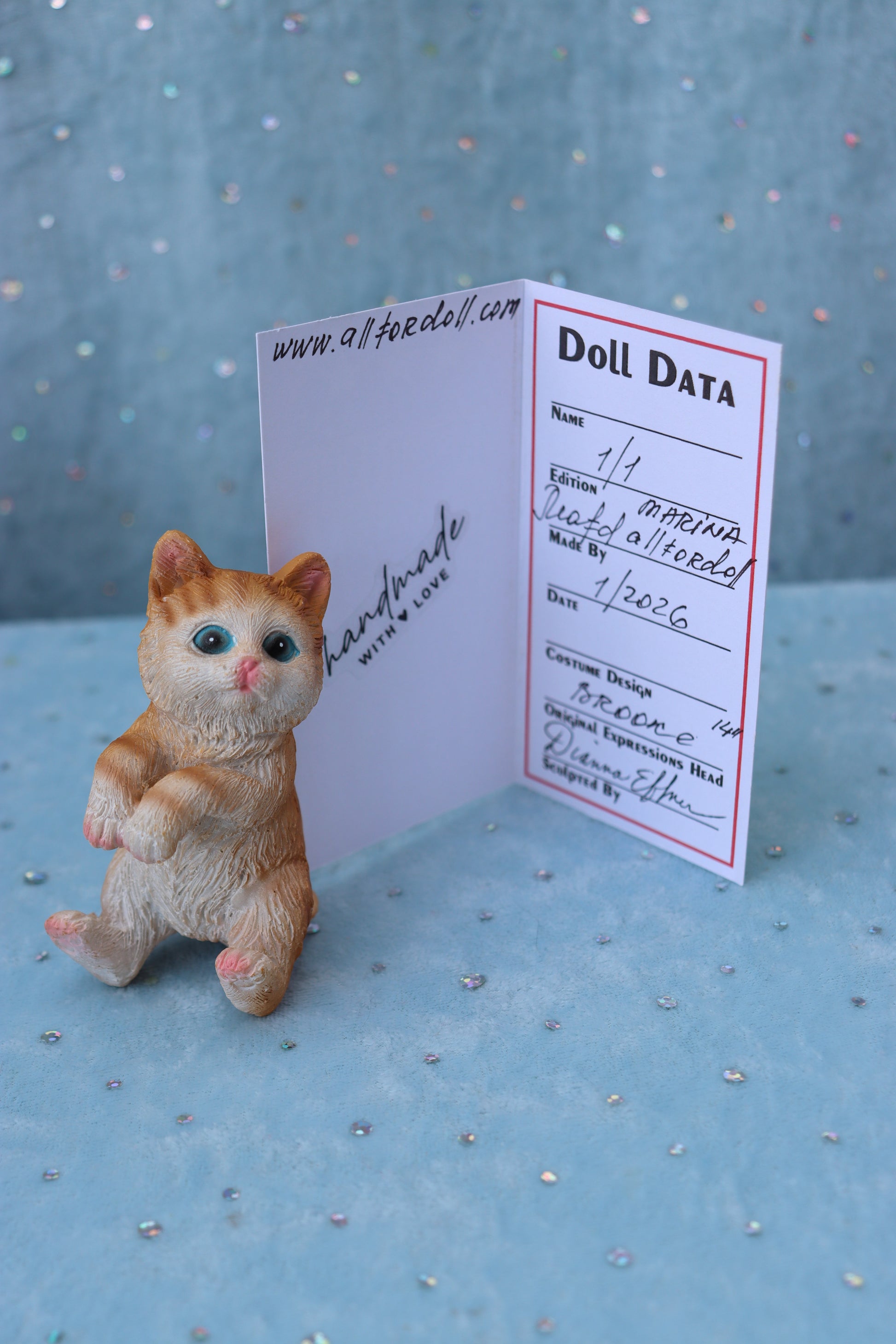 She measures approximately 14 inches tall and is made of all porcelain with five points of articulation. The doll is brand new, created in January 2026. She does not have a specific name, so you are welcome to choose any name you like and write it on the top line of the Certificate of Authenticity (COA). The doll is dressed in a charming vintage-style outfit. She comes exactly as pictured with COA, a mini resin kitty but without a stand.