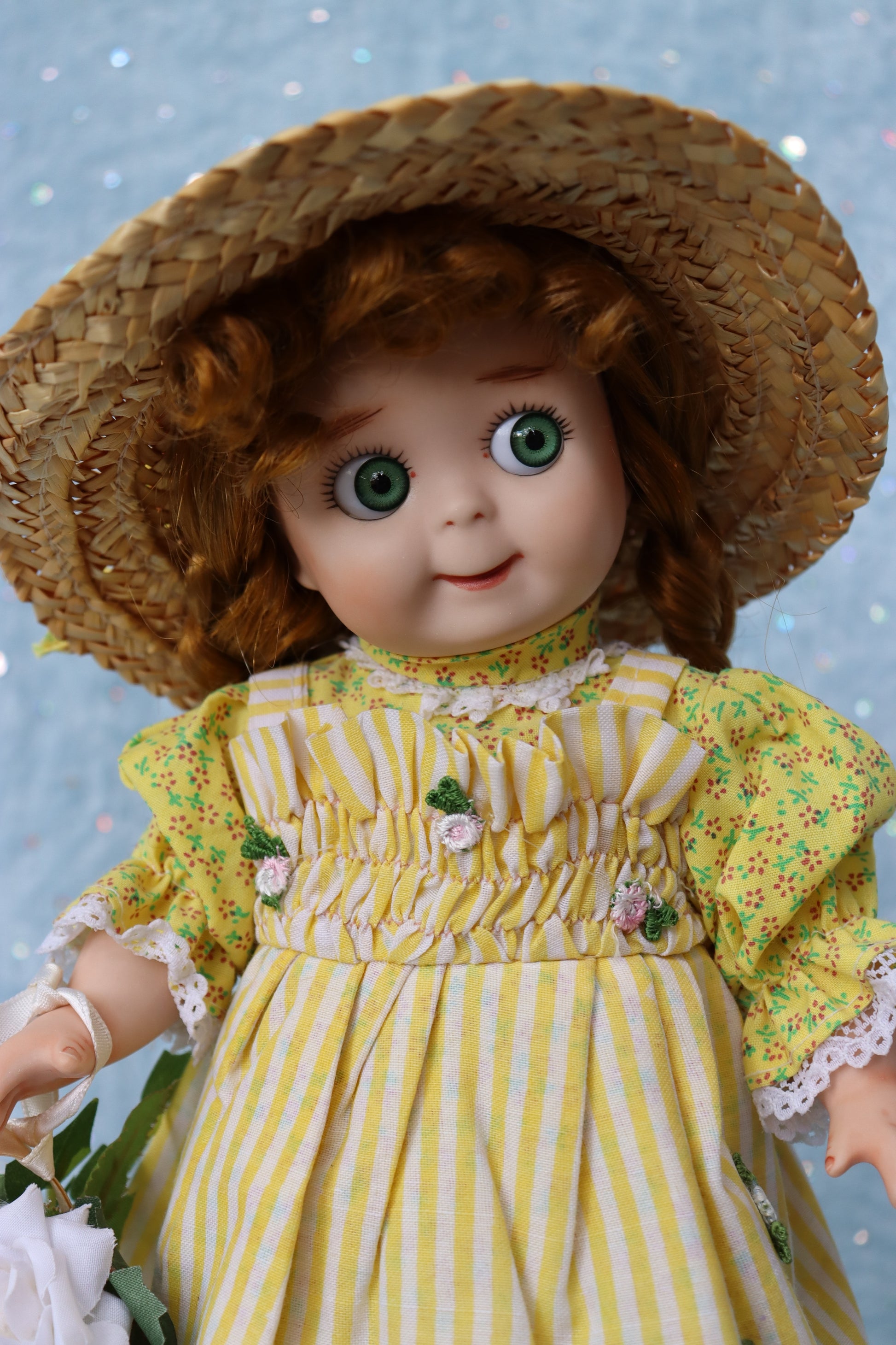 This collectible doll was poured from the mold "Little Googly" (Seeley S-8); the sculpt is by renowned mold company Seeley. This doll is an Antique reproduction of JDK 221 Kestner, Germany. The doll handcrafted to be a One Of A Kind (OOAK) doll by artist "Mafd&Co". She doesn't have an exact name, so please feel free to name her :) She is new - July 2025.