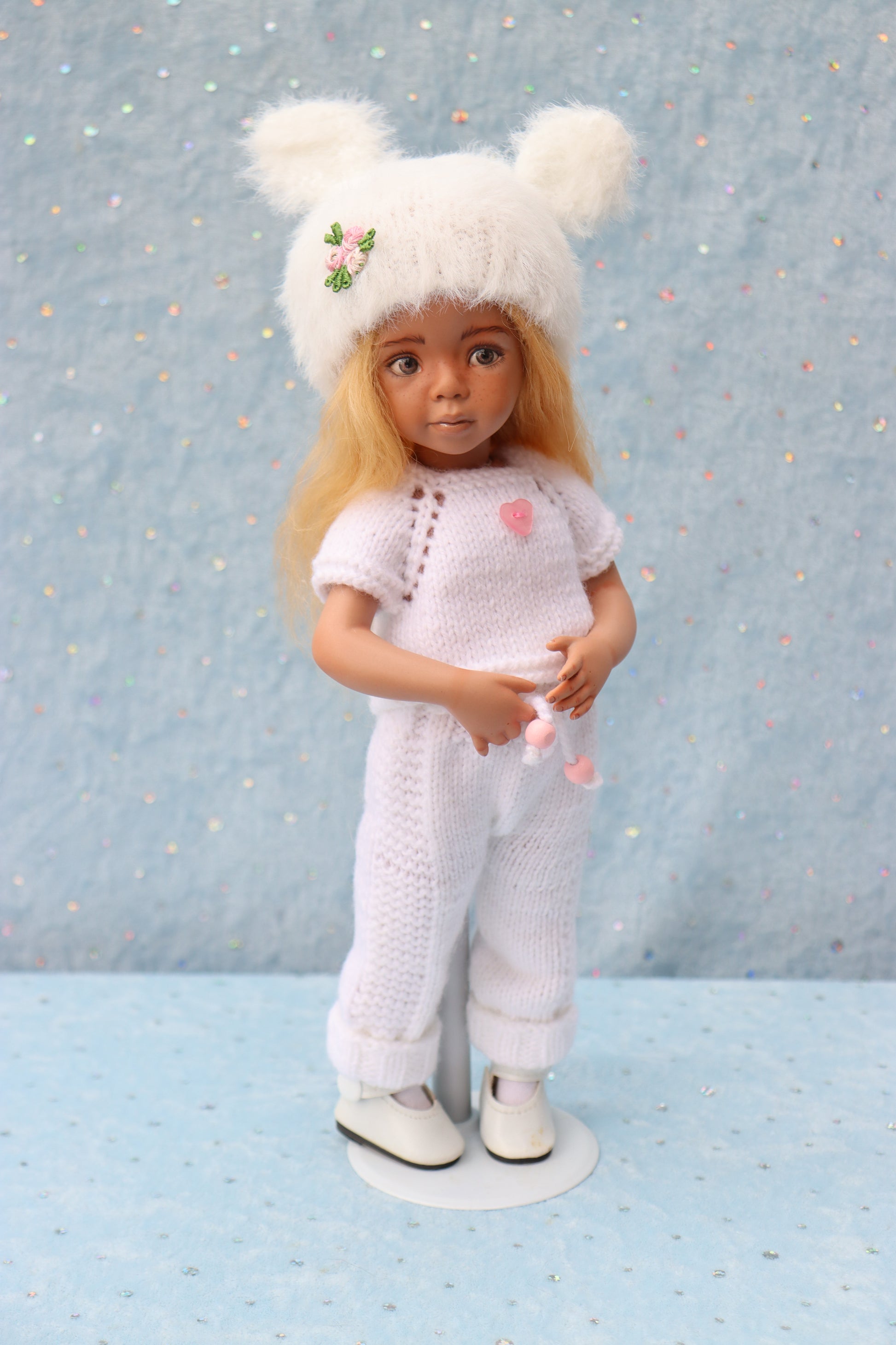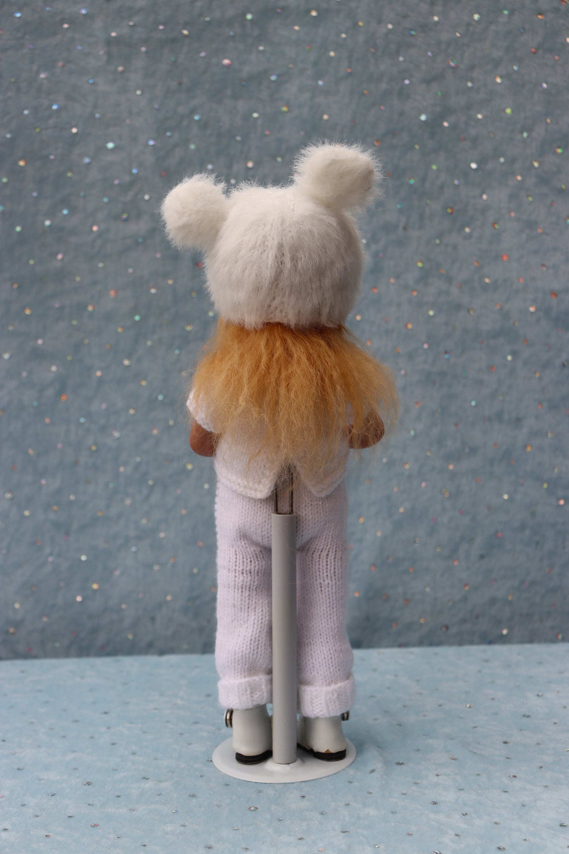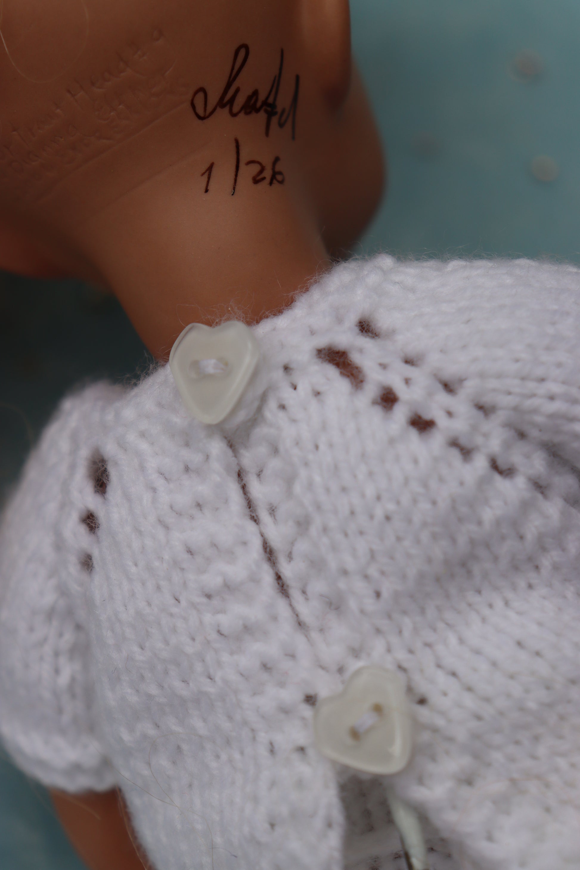 She measures approximately 11 inches tall and is made of all porcelain with five points of articulation. The doll is brand new, created in January 2026. She does not have a specific name, so you are welcome to choose any name you like and write it on the top line of the Certificate of Authenticity (COA). The doll is dressed in a beautiful knitted outfit. She comes exactly as pictured with COA, but without a stand.