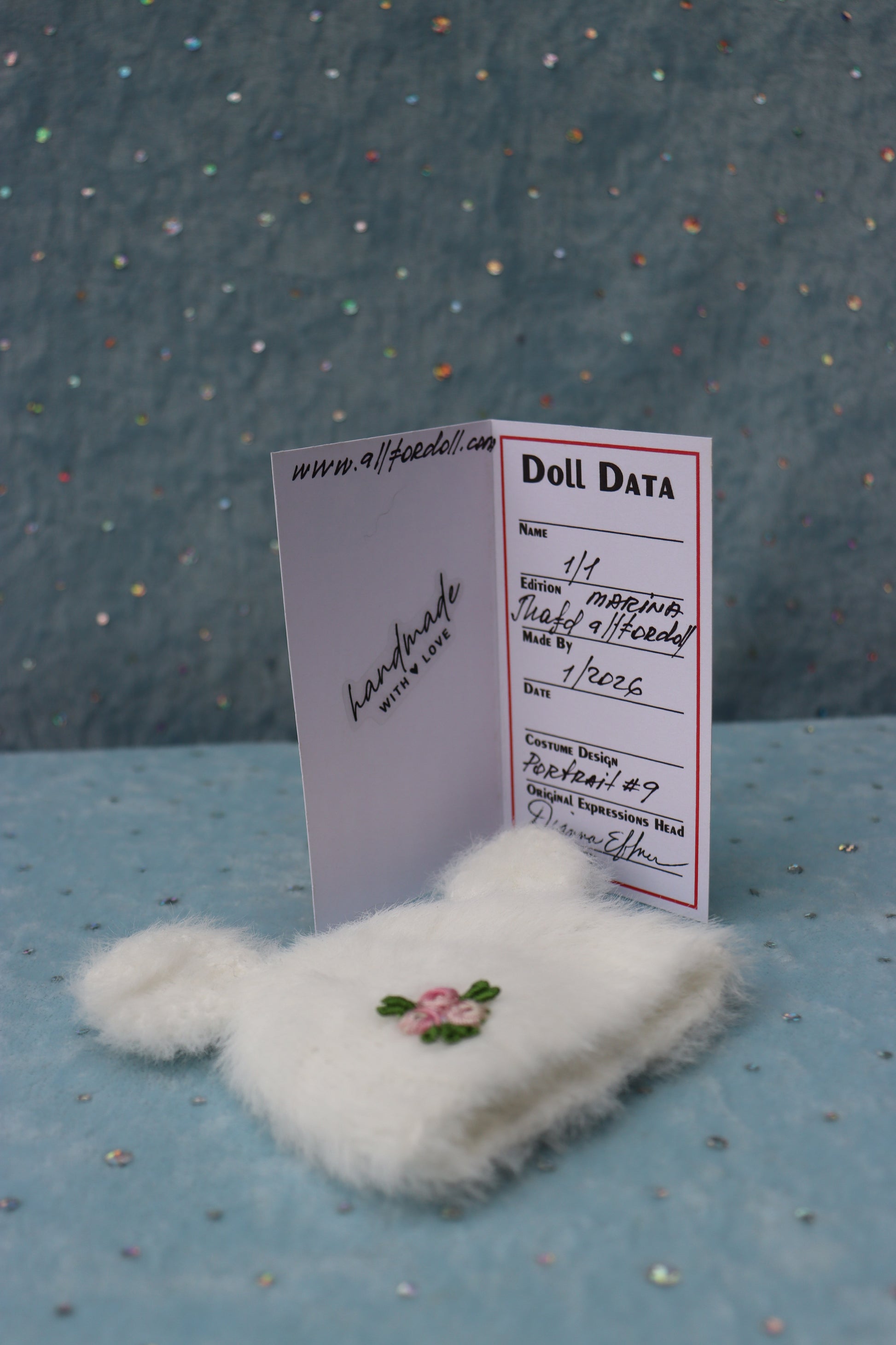 The doll is entirely handmade from “Ultra Chic” porcelain slip by artist Marina-AllforDoll-MAFD, using the “Cocoa Cream” porcelain tone. Each stage of the process is performed with exceptional care, including meticulous hand-cleaning and professional kiln firing. The eyes are hand-painted using Dianna Effner’s traditional technique, with special kiln-fired China paints, giving the doll a soft, lifelike expression. The doll bears the artist’s personal signature and the date of creation.