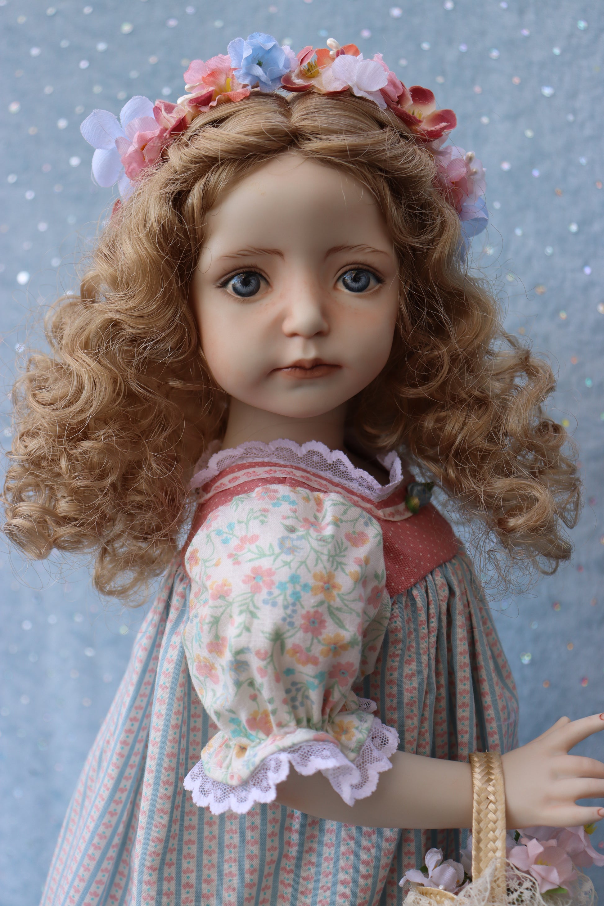 She measures approximately 20 inches tall. Head, plate, arms 3/4, legs 5/6 - porcelain + cloth body. The doll is brand new, created in April 2026. She does not have a specific name, so you are welcome to choose any name you like and write it on the top line of the Certificate of Authenticity (COA). The doll is dressed in a charming vintage-style outfit. She comes exactly as pictured with COA, a woven basket but without a stand. Her wig was created by the company Expressions specifically for her; it is even named "Laura."