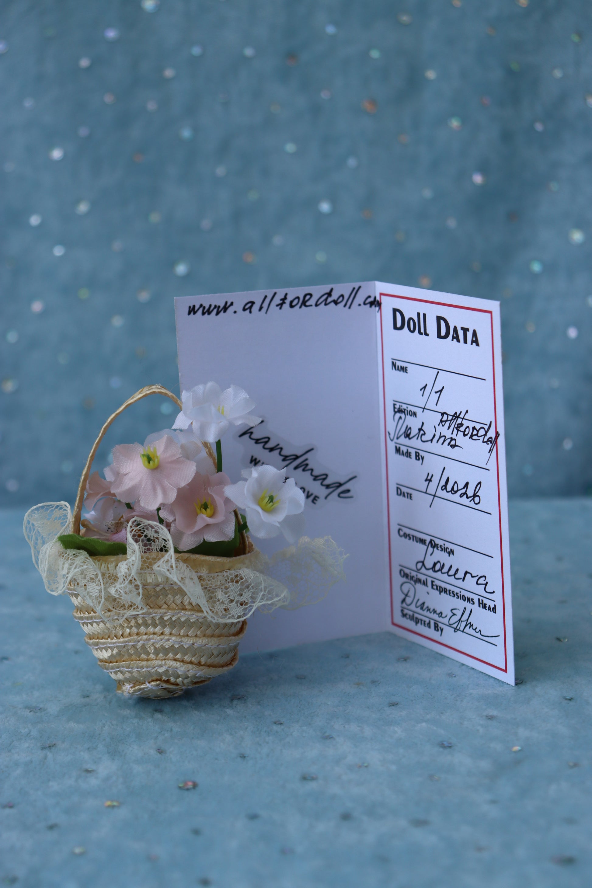 The doll is entirely handmade from “Ultra Chic” porcelain slip by artist Marina-AllforDoll-MAFD, using the “Magnolia White” porcelain tone. Each stage of the process is performed with exceptional care, including meticulous hand-cleaning and professional kiln firing. The eyes are hand-painted using Dianna Effner’s traditional technique, with special kiln-fired China paints, giving the doll a soft, lifelike expression. The doll bears the artist’s personal signature and the date of creation.